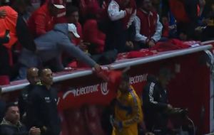 Un supuesto aficionado del Toluca aprovechó la cercanía con la banca de los Tigres para agredir al histórico goleador francés