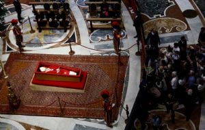 El pontífice yace en un ataúd abierto, colocado sobre una pequeña rampa mirando hacia los dolientes, con cuatro miembros de la Guardia Suiza haciendo guardia. A medida que la multitud llegaba al ataúd, muchos levantaban sus celulares para tomar una foto.