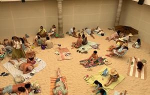 el Patio central de la Casa de cultura de Guanajuato, varias toneladas de arena crean una playa con algunas sombrillas, bicicletas, sillas, toallas, y en la que gente de diversos tipos toman el sol, juegan, duermen, observan el cielo, salen a mojarse en el mar, regresan con comida.