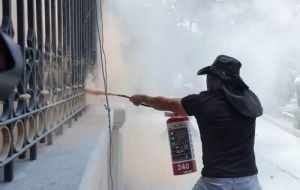 InternacionalEncapuchados protestan con violencia en Gobernación; policía los repele y CNTE se deslinda (Video) admin7 months ago01 mins Un grupo de personas que se identificaron como integrantes de la CETEG lanzó palos, piedras y toda clase de objetos contra el recinto de Segob. Los proyectiles rompieron los vidrios de algunas ventanas de la fachada. Post navigation Previous: Trabajador es atropellado mientras pintaba un muro en Nuevo León | VIDEONext: Así luce César Costa a sus 83 años de edad, luego de que el cantante tuvo que desmentir su muerte