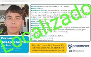 NacionalLocalizan con vida a Miguel Ángel, estudiante de la Universidad de Guadalajara a 3 meses de su desaparición admin5 months ago01 mins Él había sido visto por última vez desde el pasado 3 de abril en su domicilio, fue el tercer alumno en ser reportado como desaparecido, colectivos y la comunidad estudiantil aún exigen la localización de Jesús Bryan Huidor y Édgar Axel Ríos Post navigation Previous: Lo que se sabe del crematorio abandonado de Ciudad Juárez donde encontraron 383 cuerposNext: Miguel Ángel Navarro Quintero: “Uno no está para presumir, está uno para trabajar”