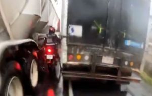 NacionalPor circular entre carriles, motociclista casi acaba prensado por dos tráilers: "Esto pudo terminar muy mal" admin4 months ago01 mins El motociclista quedó atrapado entre dos vehículos de carga cuando intentaba filtrar, presuntamente cuando circulaba sobre Periférico; fue derribado al suelo, pero se levantó por su propio pie Post navigation Previous: Lyn May confiesa que la muerte de su esposo le afectó tanto que lo desenterró para dormir con él | VIDEONext: Lluvias y falta de mantenimiento dañan puente interestatal en Guerrero